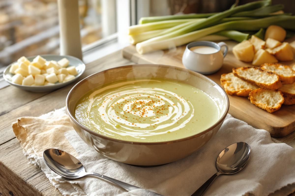 La magie vient du contraste entre les poireaux fondants et les pommes de terre riches en amidon : ensemble, ils créent une texture veloutée, presque crémeuse, sans avoir besoin d’épaississant. Une touche de crème liquide à la fin, un peu de muscade, du poivre fraîchement moulu… et chaque cuillerée devient un vrai petit bonheur.